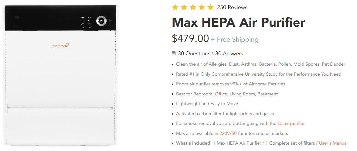 Oransi's HEPA air purifier product description is organized by bullet points for easy readability, and does a great job of describing the product's benefits. The description includes a link to an authoritative study ranking their product the most effective, and also tells the customer what rooms the purifier is best for. Even more importantly, it recommends that users seeking to remove smoke odors use a different product altogether - a great strategy to meet customer needs proactively. By steering customers towards the product they actually need, they've taken an important step towards building a happy and loyal customer base.