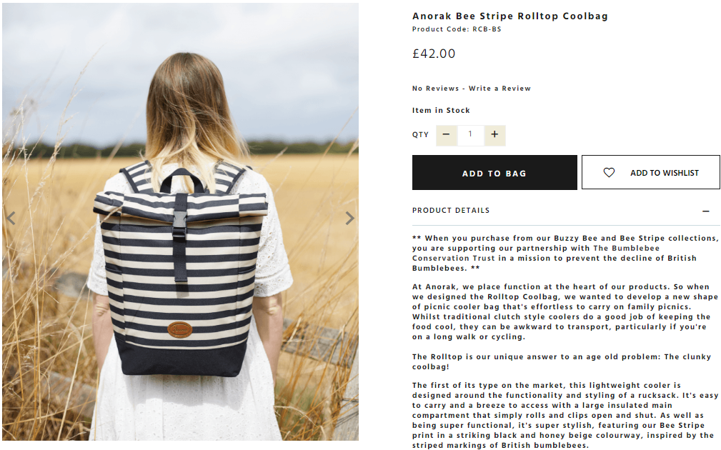 With their Buzzy Bee bags, Anorak gets straight to the point when it comes to emphasizing their conservationist message. Each bag purchased helps support the Bumblebee Conservation Trust, a cause that customers can feel good about. Plus, the product description does an excellent job of explaining how the bag solves customer pain points and describing the product's features. Pair that with a super cute bumblebee-inspired design, and you've got a winner.