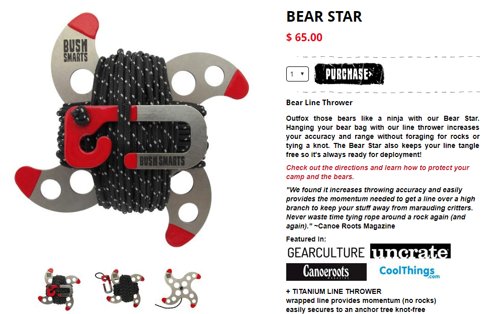 Bushsmarts does a great job of explaining the benefits of a product the average camper never knew they needed - the Bear Star. The Bear Star makes it easy to hang your food out of reach of bears, which any experienced camper will tell you is very important. The true value of this product description lies in the testimonial from Canoe Roots Magazine, who vouch that this product makes it much easier to hang your bear bag without needing to tie rope around a rock and throw it over a tree limb. (As someone who has brained themselves with a rock trying to do exactly this, the author can testify to the 'pain' part of this pain point). If you're describing a product that your audience is unfamiliar with or wasn't aware that they needed, make sure to emphasize how useful the product is in the product description. Plus, an expert testimonial never hurts!