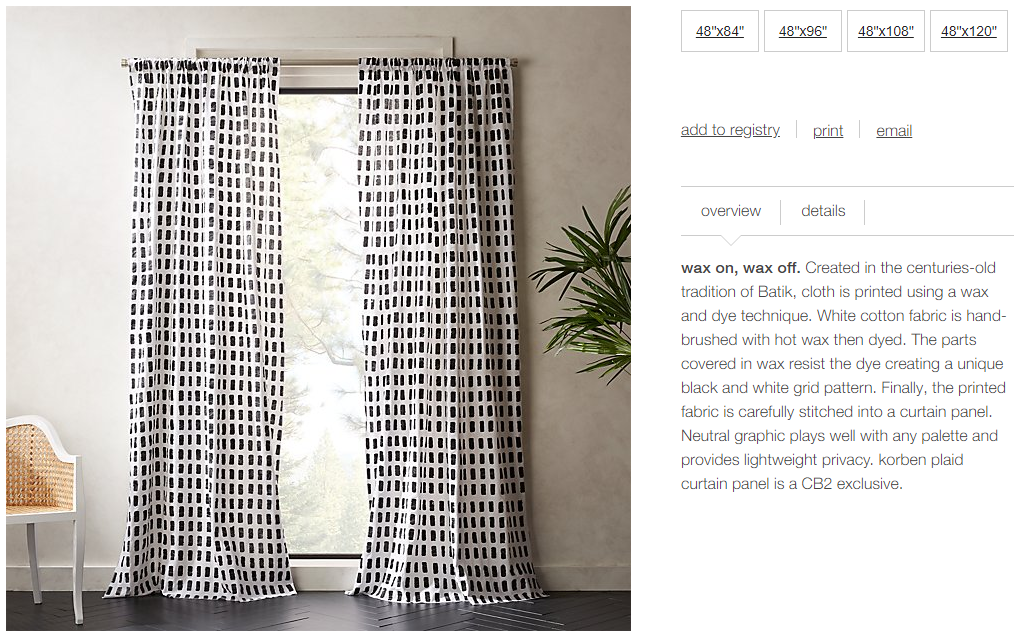 Instead of listing out the features, CB2 weaves it into the beautiful prose that is their product description. The product description does an excellent job of capturing the history of these striking curtains, while also giving a detailed description of how each is hand-made. Next, they wrap it up by describing how it will complement almost any room or color palate, and how the curtains provide privacy without looking or feeling heavy. Finally, they emphasize the exclusivity of the product by letting the customer know that these are a CB2 exclusive. For fashion-forward shoppers, uniqueness is important - there's nothing worse than getting a hot new product and then seeing it everywhere the very next day.