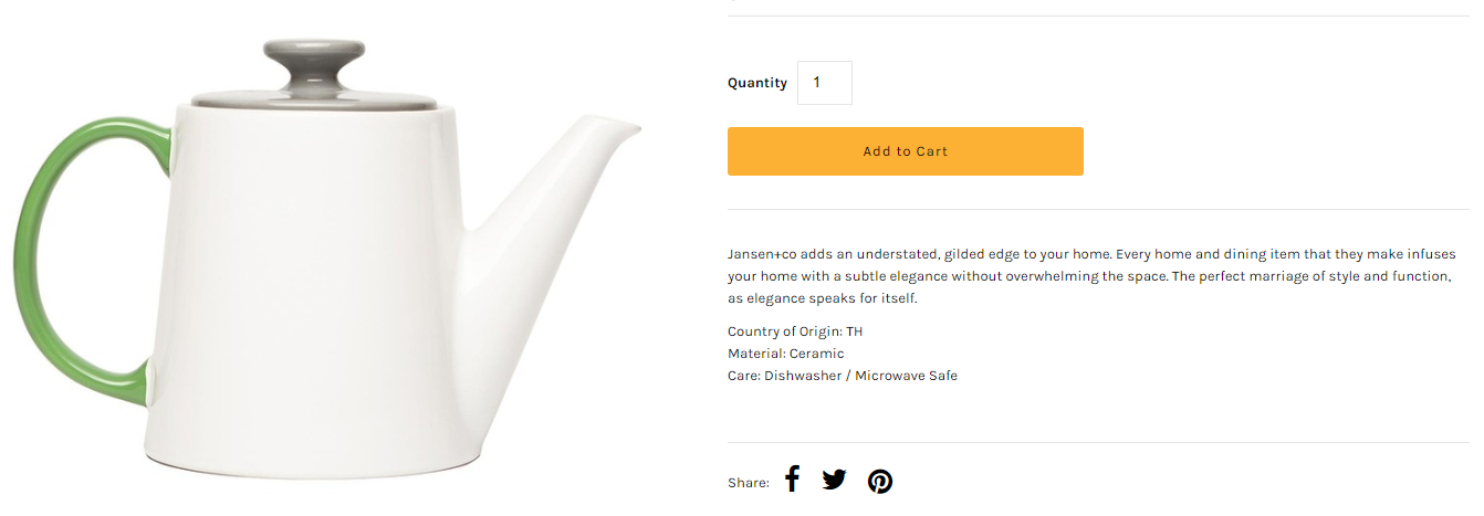 Fab's minimalistic teapot speaks for itself - and the product description lets it. This description matches the minimal design of the product by emphasizing the subtle elegance of this teapot, and avoids lengthy descriptions of its aesthetic that might over-sell its simple design.