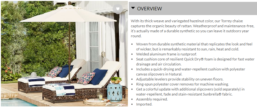 Pottery Barn does an excellent job of explaining the benefits of their product in this description. By emphasizing the product's weatherproof, rustproof, quick-drying materials, they've addressed most customers' key concerns when it comes to outdoor furniture. For functional, everyday products, spend some time identifying the most common questions asked about its usefulness, and answer them in the product description. Sometimes your customers are just as concerned with function as with form, so don't make them click through to an FAQ form or read a ton of reviews to get the information they need.