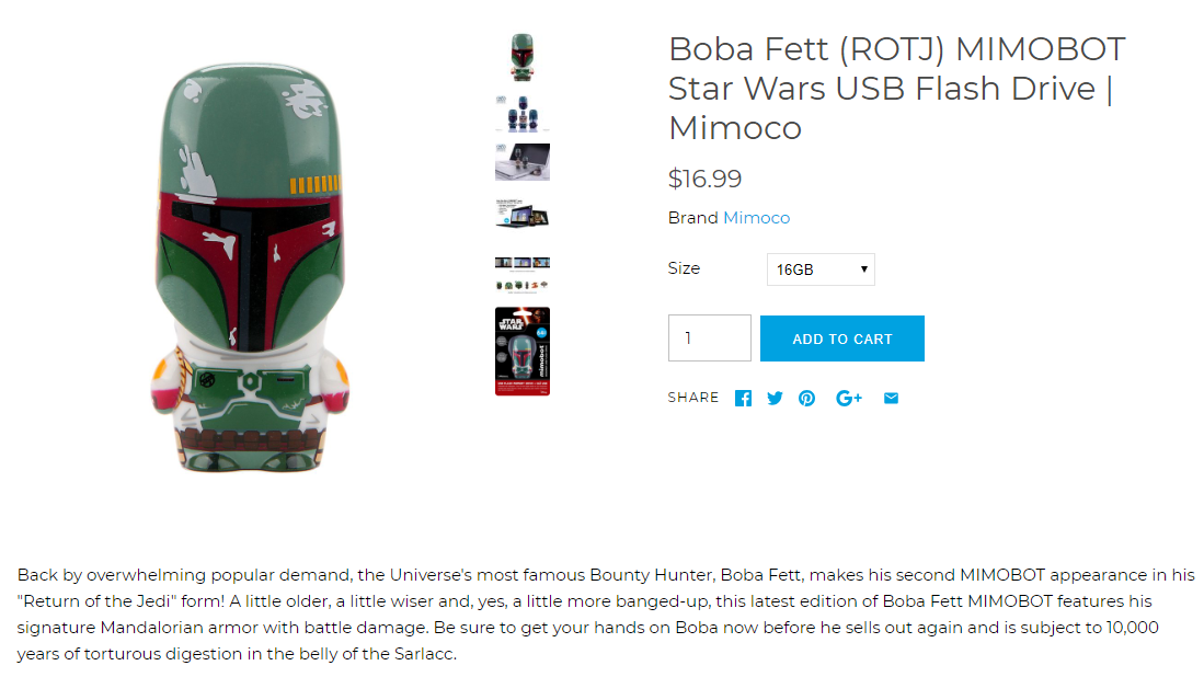 This Star Wars-themed USB drive from Mimoco is meant for a niche audience, and its product description shows it. This product description is meant for fans of the series, and doesn't bother explaining the inside jokes and references to clueless nerf-herders. By speaking to their audience in a language they understand, they reinforce their niche credibility. Plus, this product description does a great job of reinforcing how in-demand this product is, and makes the customer want to capture this hard drive before some other bounty hunter picks it up first.