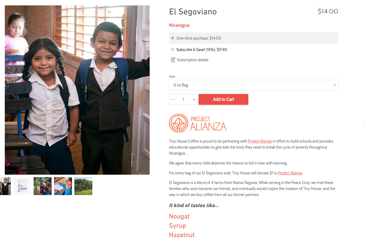 Tiny House Coffee does a great job of blending their company's mission directly into their product description, giving them the type of authenticity that can't be faked. This coffee is purchased from friends made while the founders were serving in the Peace Corps, and every bag sold helps build schools for the very community that inspired this small coffee business in the first place. The product description and photography both focus around the Nicaraguan families that the coffee is directly purchased from, an an informal "It kind of tastes like..." flavor profile help describe the coffee without getting snooty about it. If your company is built around authenticity, don't be afraid to get a little personal in your product descriptions - people prefer doing business with people that they feel like they know.