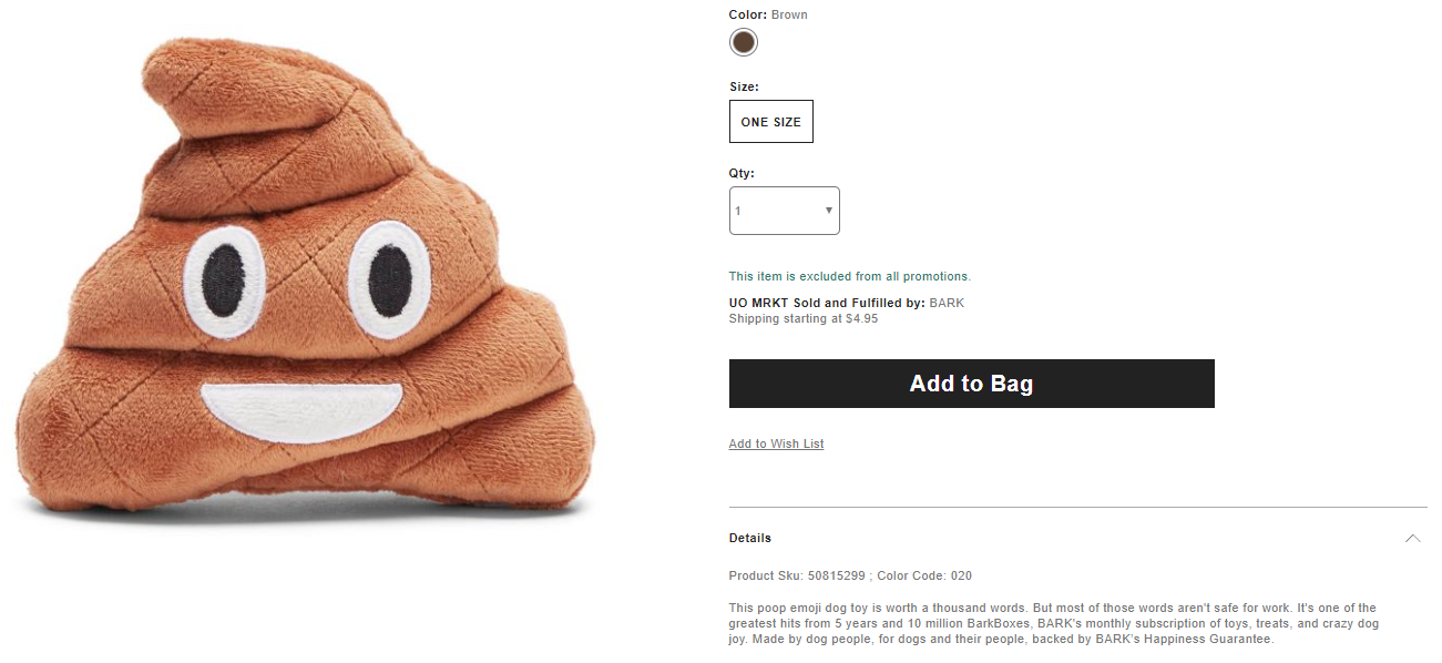 Urban Outfitter does a great job of describing the indescribable - Brownie the Happy Poo Emoji dog toy. Urban outfitter blends humor and credibility into this product description, giving the reader a laugh while emphasizing that this toy has been a favorite for over 10 million BarkBox subscribers. By catching the reader's interest with a joke and then building credibility, this product description does double doody.
